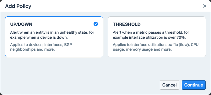 - In the Add Alert Policy Dialog, select Up/Down and click Continue.
