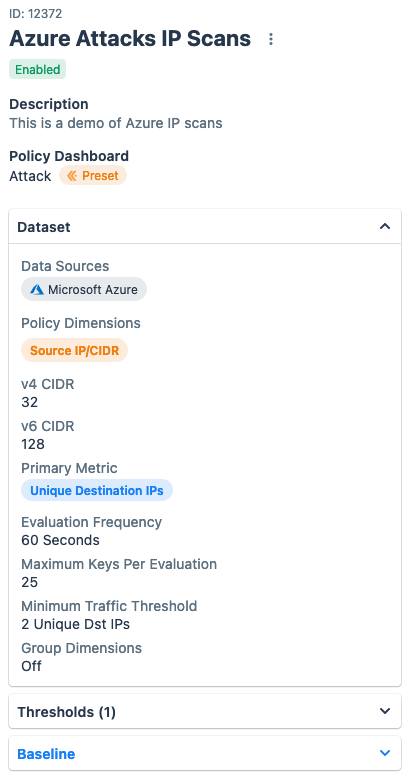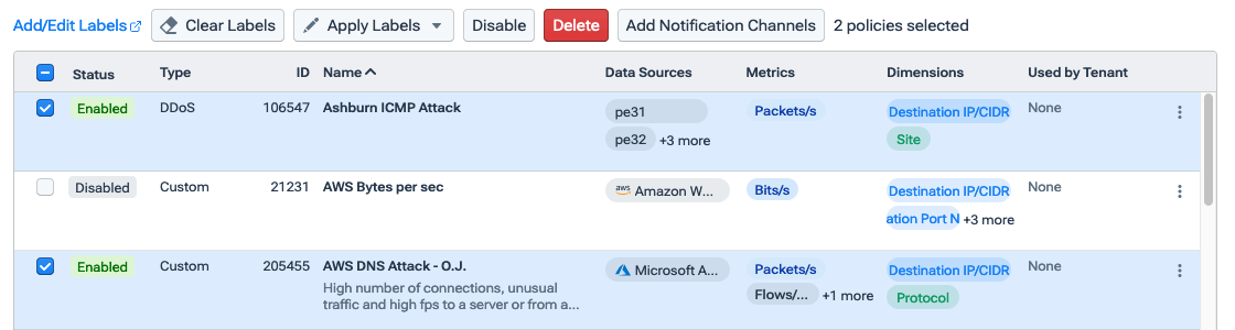 - To disable an enabled policy, choose Disable from the popup. The policy will no longer monitor its dataset, generate alerts, or trigger mitigations.