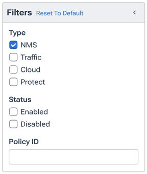 - Type: The types of policies to include in the list (NMS, Traffic, Cloud, or Protect; see Policy Types).