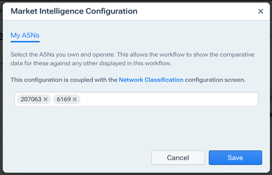 - Comparison ASN: A drop-down from which you can select one of your organization’s ASNs (as entered in your Network Classification settings) to compare with the specified AS. This control is only available on AS Details pages (see Filter Controls by Tab).