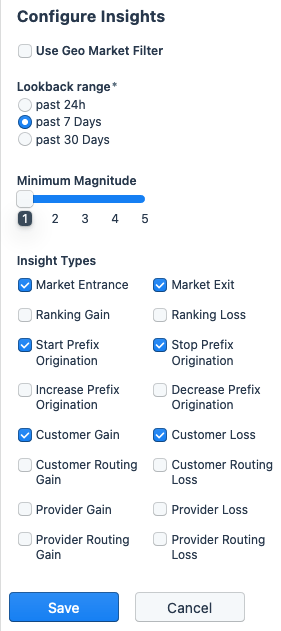 - Market Entrance: An AS is newly transiting prefixes that are geolocated to the market currently set with the Geo Market filter. The insight includes the AS's rank in that market.