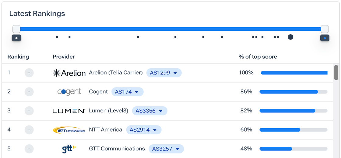The Latest Rankings pane of the Kentik Market Intelligence page is made up of the Latest Rankings table and its associated range filter, which are covered in the topics below.