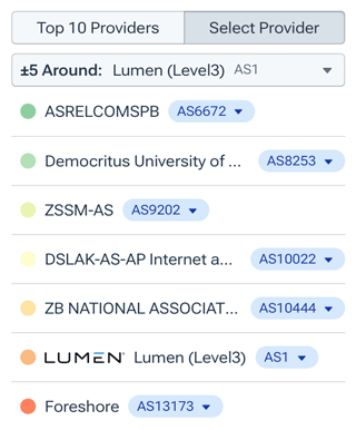 Top 10 Providers (default): The list and chart show the current top-10 of the post-filter providers.- Select Provider: The list and chart show five providers on either side (in terms of ranking) of the provider selected with the See +/-5 around drop-down. For example, if the ranking of the selected provider is 100, the other displayed providers will be those with rankings from 95-99 and 101-105. If no provider is selected, the displayed providers will be the current top-10 of the post-filter providers.