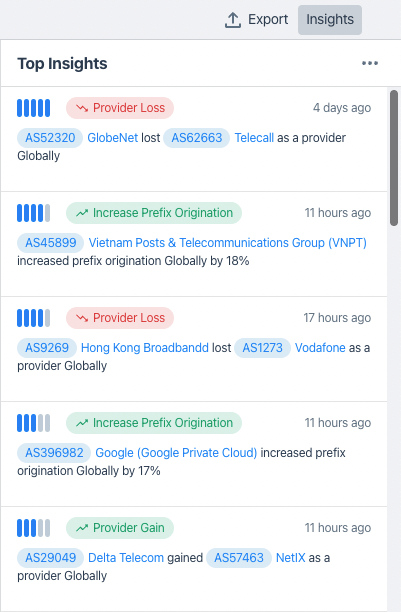 - Provider Routing Gain: A provider AS has increased the IP space transited from this AS. The insight shows the name of the AS, the provider to which it increased routing, and by what percentage.
