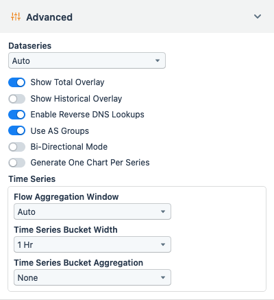 Kentik supports a number of advanced options that can help you tailor queries to return precisely what you need to see. The controls for these options are located in the Advanced pane of the Query sidebar in Data Explorer and in the configuration dialog for individual dashboard panels. The following topics explain the associated options and their controls: