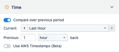 Compare over previous period: A switch that enables "period over period" comparison of the query results from the currently defined time range with results from the same query looking at a previous time range of the same duration. By default the switch is off. When the switch is on, the Time Range drop-down is labelled "Current" and the Previous controls are displayed.