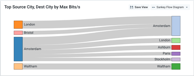Note: Unless the group-by dimension is Destination BGP AS Path, you must have at least two group-by dimensions to use the Sankey view type.