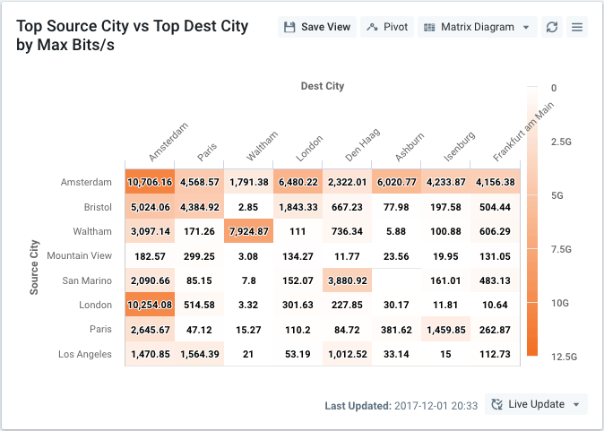 In the following example, the metric is packets/second, Visualization depth is set to 8, and Display and Sort By is Average. The group-by dimension is Source: City and the matrix-with dimension is Destination: City, so the vertical axis shows the top 8 source cities as measured in average packets/second, and the horizontal axis shows the top 8 destination cities filtered by the source cities. The cells of the table are populated with average packets/second between the cities on the two axes.