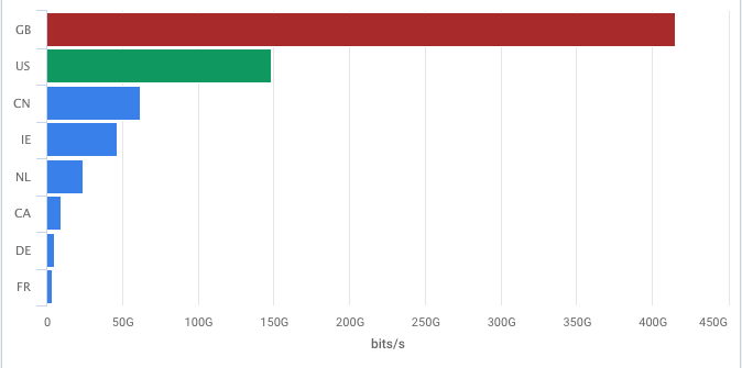 The top rows in the returned data are plotted as individual bars against a horizontal axis representing the metric being counted, and the combined total is also plotted. This approach is useful for comparing series aggregates over time, where series vs. series is more important than series vs. total. For example, you might use this view to answer questions such as, "How much traffic did we send on each of our peering and transit links this month?"