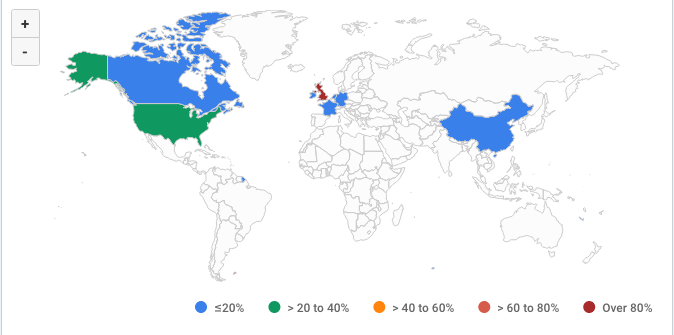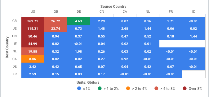 A Geo HeatMap is a zoomable map that displays the geographic distribution of a metric, for example the traffic volume associated with various physical locations. Each geography is colored according to its rank relative to other geos.