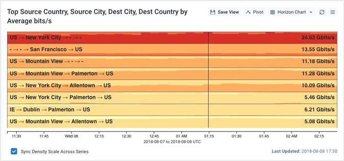 This approach is especially useful for visually identifying series or time slices that are outliers (high or low). It can also result in a more informative visualization than a stacked area chart when there are a large number of series. A horizon chart can be useful for answering questions such as, "Are any of the devices we're monitoring sending more flows than normal, and have any of them stopped sending flows?"