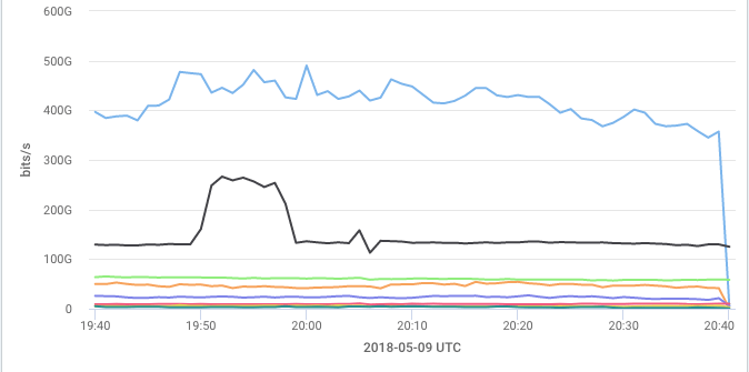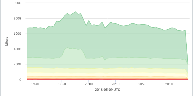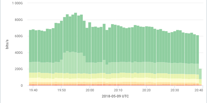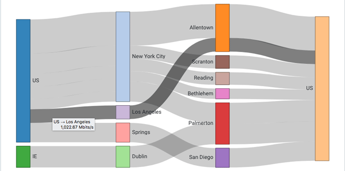 A Sankey diagram is used to see connections across the various dimensions that make up a key (see About Keys), such as how much of a given source IP's traffic is going to each of its various destination IPs via various intermediate hops. It's especially useful when visualizing these relationships across three or more related dimensions. Each dimension in the diagram is represented by a colored vertical bar, and the width of the gray bands between the bars is proportional to the quantity of traffic in common between those dimensions. Some fairly complex questions can be represented, such as, "For the traffic that is being sent from my network to the Netflix AS, what protocols and ports are being used, how much of it originated inside my network, and what was the source AS of the outside traffic?"