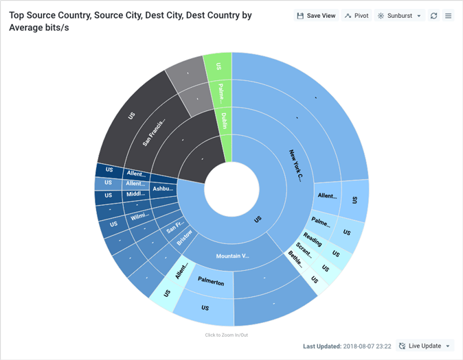 A sunburst chart is similar to a Sankey in terms of visualizing relationships among dimensions in a key (see About Keys), but better for visualizing each dimension's contribution to the total. The dimensions that make up the key definition are represented as concentric rings (from inner to outer) that are segmented into wedges representing the top rows returned from the query (segments with the same value for a given dimension are joined into one). The number of segments is determined by the visualization depth (see Advanced Query Settings). A sunburst chart might be used to answer a question such as, "What's the relative distribution of traffic volume by TOS/DSCP, and for each value, what are the destination protocols, ports, and IP/CIDR subnets?"