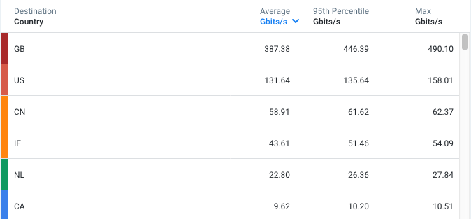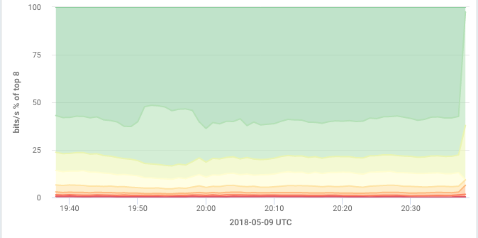 This chart type is similar to a standard stacked graph, but providing an indication of relative rather than absolute value. Each row is shown as a percentage of the total traffic returned from the query, so the entire area of the graph is always filled but the proportion of vertical space represented by each row of results changes over time. This is useful for seeing changes over time in the top series, not only in relation to one another but also in relation to the total. For example, this view might be used to answer a question such as, "What percent of the traffic we're serving is going to each Country, or to each Custom Geo?"