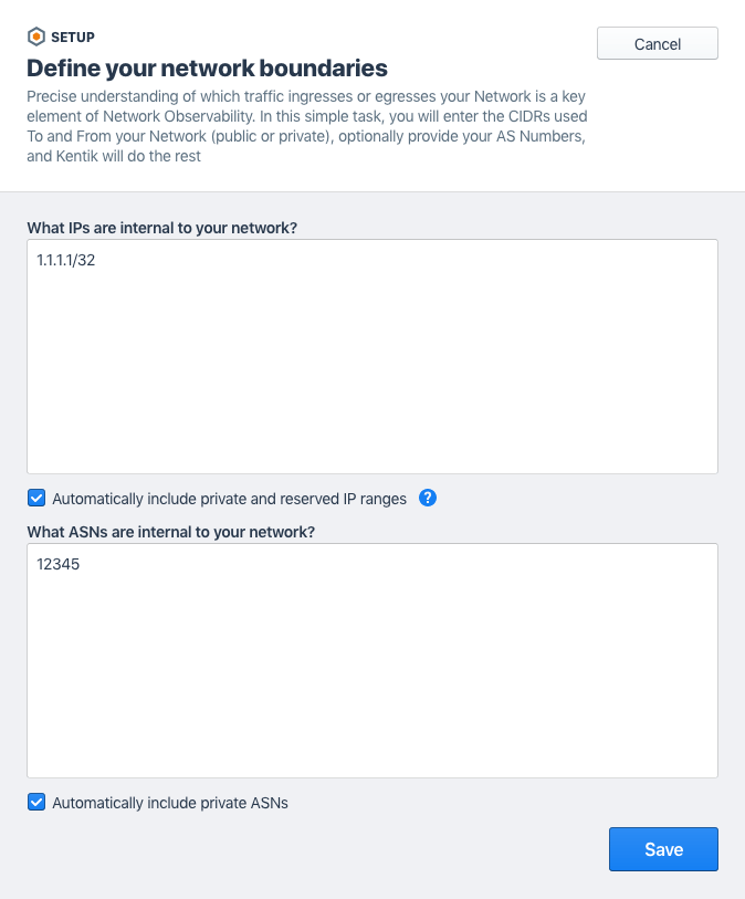 Note: Connecting a router involves configuring the router itself to send flow data (NetFlow, sFlow, etc.) to Kentik. - Define Network Boundaries: Enter the CIDRs used to and from your network (public or private) and optionally provide your ASNs to enable Kentik to determine which of your interfaces are externally facing and therefore which traffic comes into (ingress) or goes out of (egress) your own network (see Define Network Boundaries).