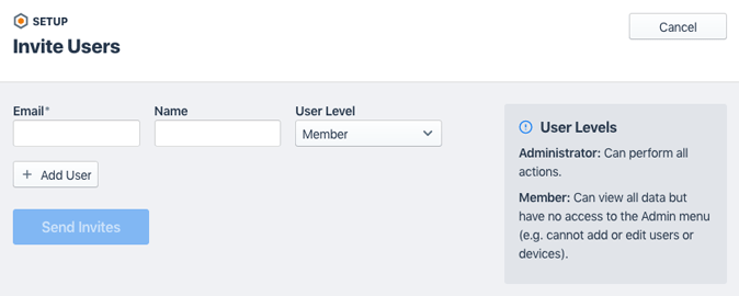 - Click the drop-down User Level selector to set a level for the users. Admin users can both see data and make settings, while Member users are generally not able to make settings. - To add additional users, click the Add User button and fill in the form for each added user. To remove a user use the trash icon