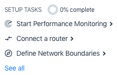 Because trial signup is a required prerequisite to onboarding, if you don't already have an account then your setup process will begin on the main Kentik website (see Starting Your Trial) rather than on the Kentik portal. After your organization's Kentik account is activated your first login takes you to the setup workflow in the portal. After gathering information about the types of data — flow telemetry, cloud metrics, synthetic testing — for which you'll initially be using Kentik, the rest of the workflow consists of a number of "setup tasks" that are initiated from the Welcome to Network Observability page.