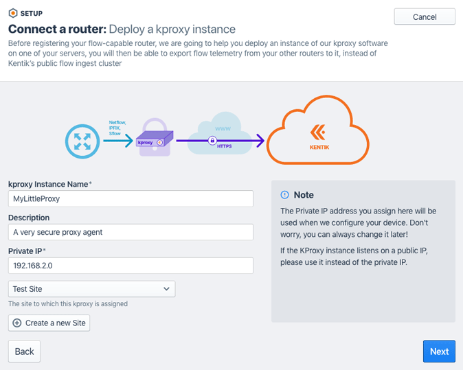 The next step in the kproxy wizard path is the Set up kproxy page. This page is equivalent to the Adding a kproxy Agent dialog on the v4 portal's Settings » kproxy agents page. For information on how to complete this step, see Add kproxy Agent. When setup of your kproxy agent is complete you'll be taken to the Register your flow source page (see Device Setup Steps), at which point the setup steps for devices become the same whether the device exports flow directly or via kproxy.