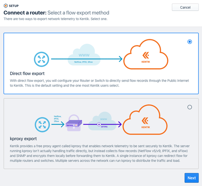 On the first page of the wizard, you'll be asked to choose how you'd like the router's flow data (NetFlow, sFlow, etc.) to get to Kentik. On this page you'll choose a method and click the Next button.