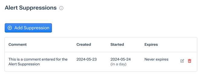 - Remove (trash icon): A button that opens a confirmation dialog enabling you to remove the alert suppression.