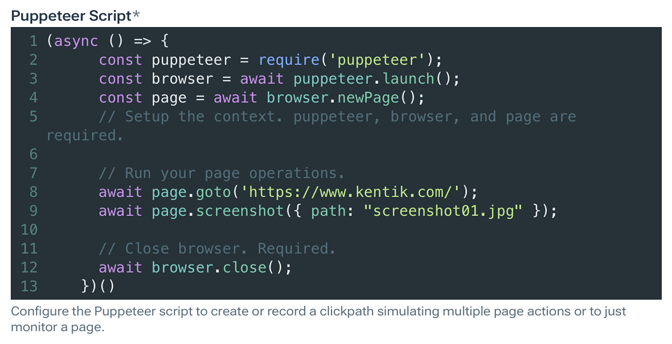 - The script must include declarations of the consts puppeteer, browser, and page as shown at the start of the example script. - At each point in the series of actions where you'd like a screenshot taken of the page state, insert the following line at the corresponding point in the script: