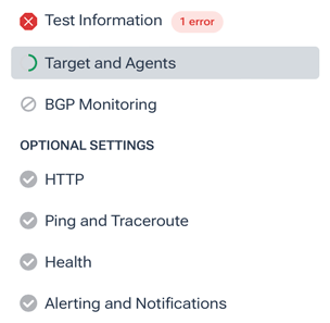 Note: This step doesn’t apply to BGP Monitor tests. - Continue through the other tabs above the Optional Settings heading, completing any other required settings.
