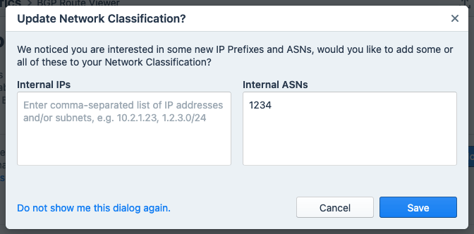- Internal IPs: A field in which to enter a comma-separated list of IP addresses and/or subnets that will be added to the IPs classified as internal by Network Classification. By default the list will be populated with the IPs from the View/Update Prefixes and ASN(s) dialog that don't match your existing Network Classification IPs.