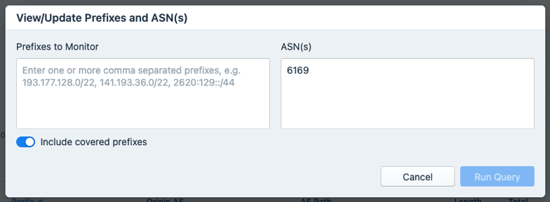 - View/Update Prefixes and ASN(s): A button that opens the View/Update Prefixes and ASN(s) dialog (see Prefixes and ASNs).