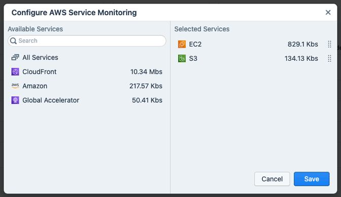 - Available Services: A list of services that Kentik has identified as being used by your AWS or Azure cloud resources. Use the Search field to filter the list to services whose name matches entered text.