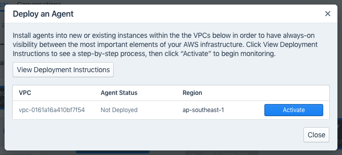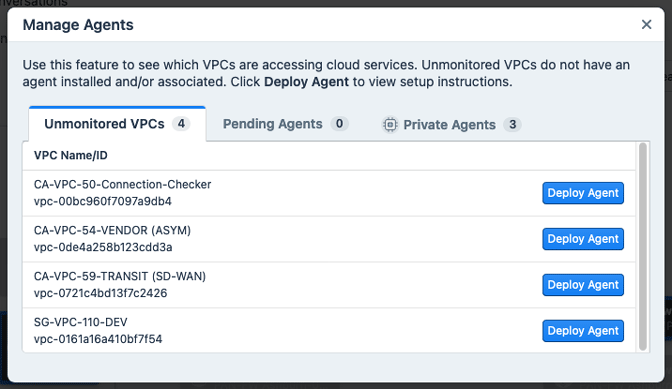 - Unmonitored VPCs: A list of VPCs on which no agent has been installed. To deploy an agent on a VPC, click the Deploy Agent button, which opens the Agent Deployment Instructions dialog. The workflow for this dialog is the same as for Private Agent Setup.