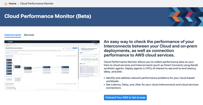 Cloud Performance Monitor, which is visible in organizations with at least one Kentik-registered AWS cloud, features the following tabs: