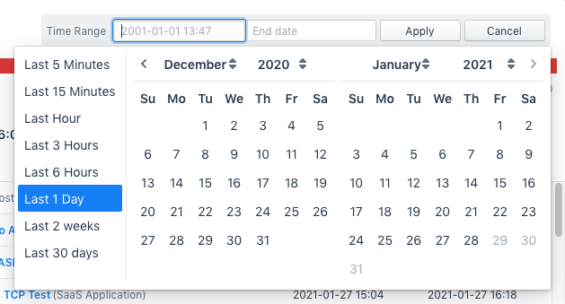 - Time Range: Two fields that each show a date-time, one for the start of the range and the other for the end. The fields are populated by clicking on the lookback list or on the calendars.