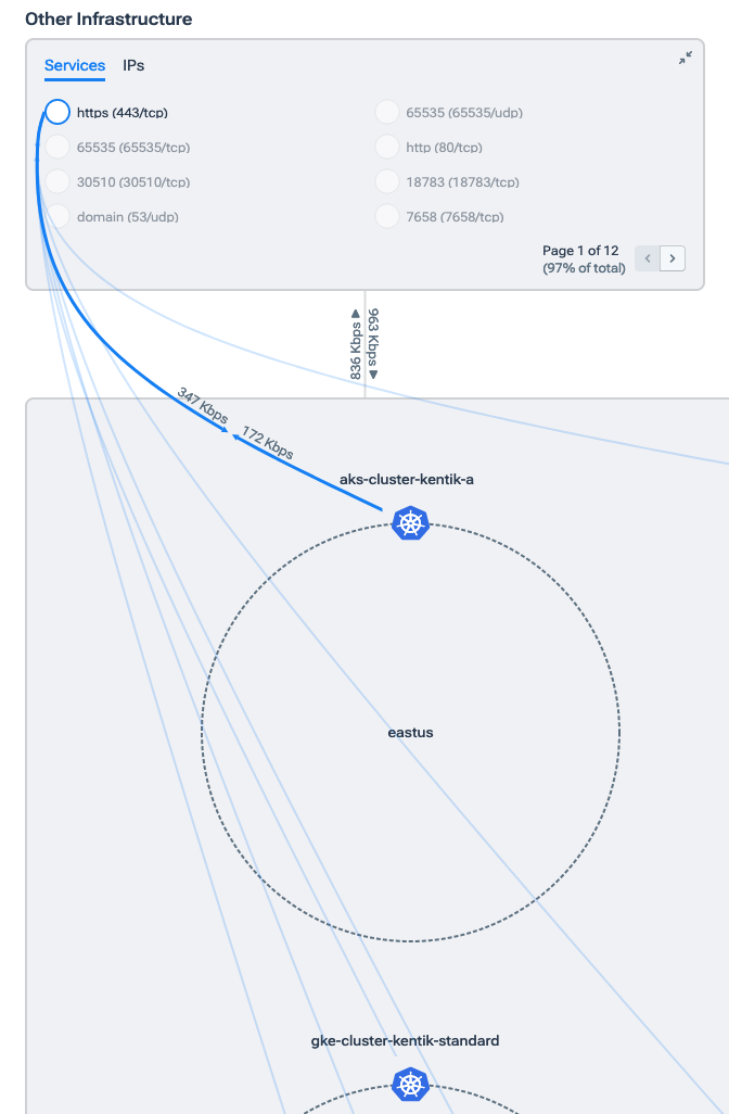 - Cluster indicator: A box between the Other Infrastructure block and the Internet block that indicates the cluster that the page is about. Click the Change link to return to the Kentik Kube page, where you can choose a different cluster.