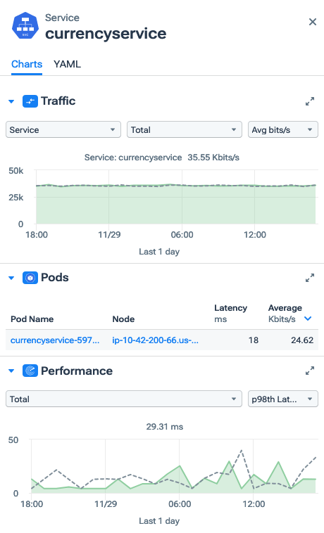 - YAML (namespace, service, and deployment details only): A tab giving configuration YAML for the entity.