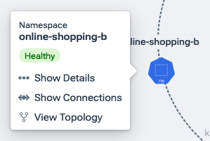 Note: This item is not active when the cluster has no namespaces. - View Topology (namespaces only): Go to the Namespaces page for this namespace, where the Kubernetes block will show the namespace's services and deployments.