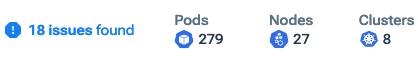 Issues indicator (warning icon): A button indicating the number (if any) of high latency pods and nodes. Click to open the Kubernetes Problems dialog for a list.- Pods: The total number of pods in your organization's Kentik-connected Kubernetes clusters.