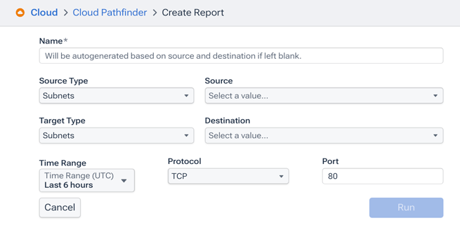 - On the Cloud Topology view, click a VPC or subnet object and choose Cloud Pathfinder from the resulting popup. This will take you to the Create Report Page with the Source type and Source fields already specified.